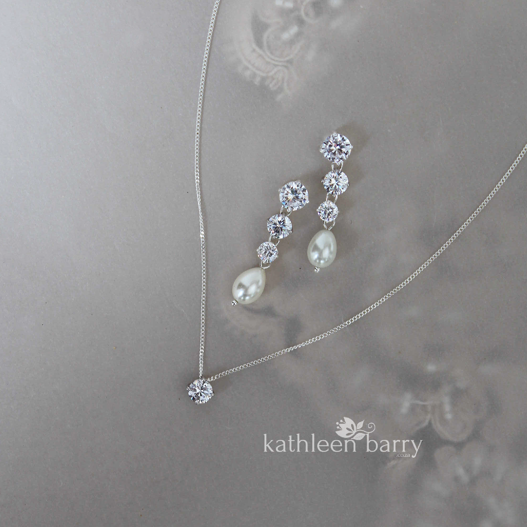 Kirsten Back drop silver, cubic Zirconia and OR pearl necklace. Rose gold & gold also available