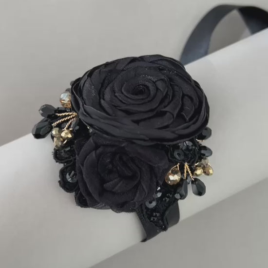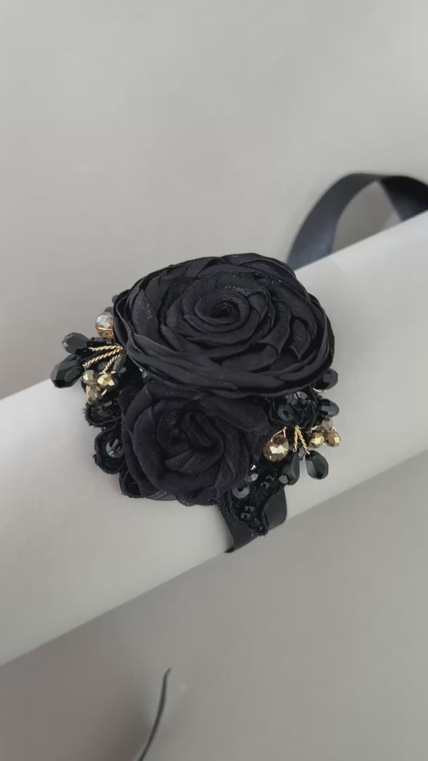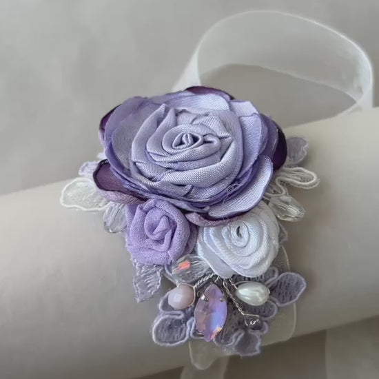 These wrist corsages have been made from hand dyed, corded bridal lace, handmade organza fabric Roses, embellished with pearls and crystals. (elements can vary slightly due to color selection)