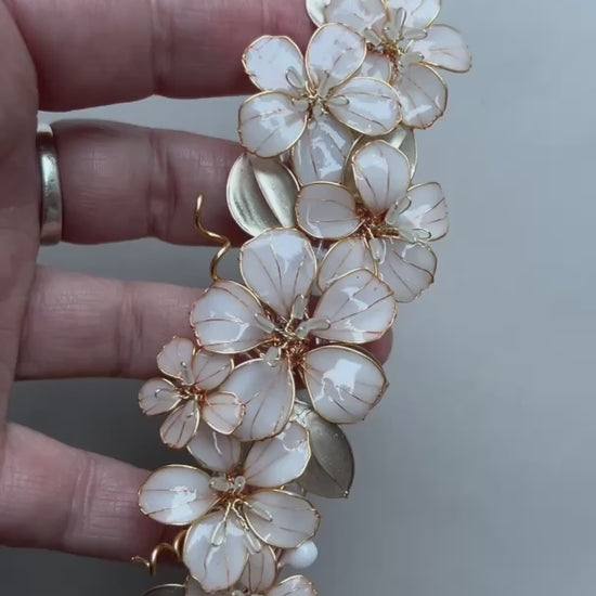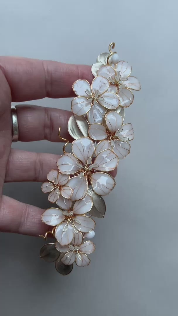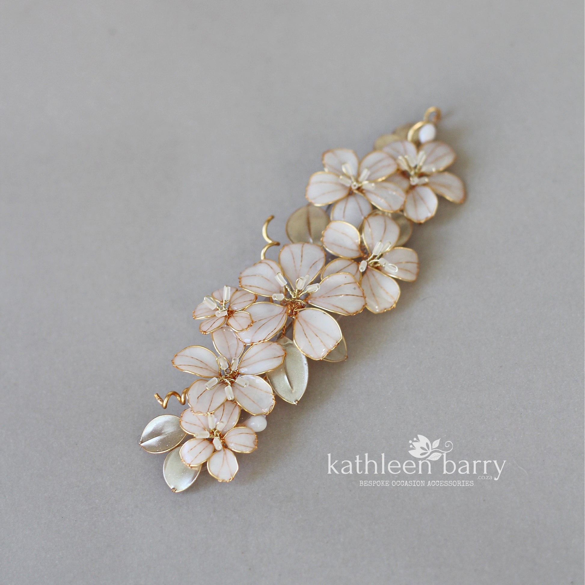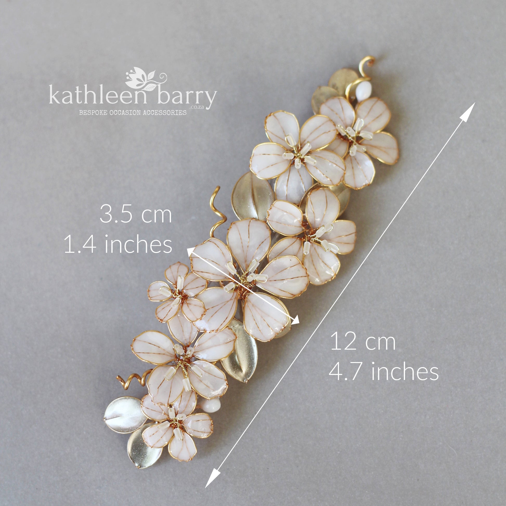 Shown in a pearly opaque milky off-white with matte pale gold leaves