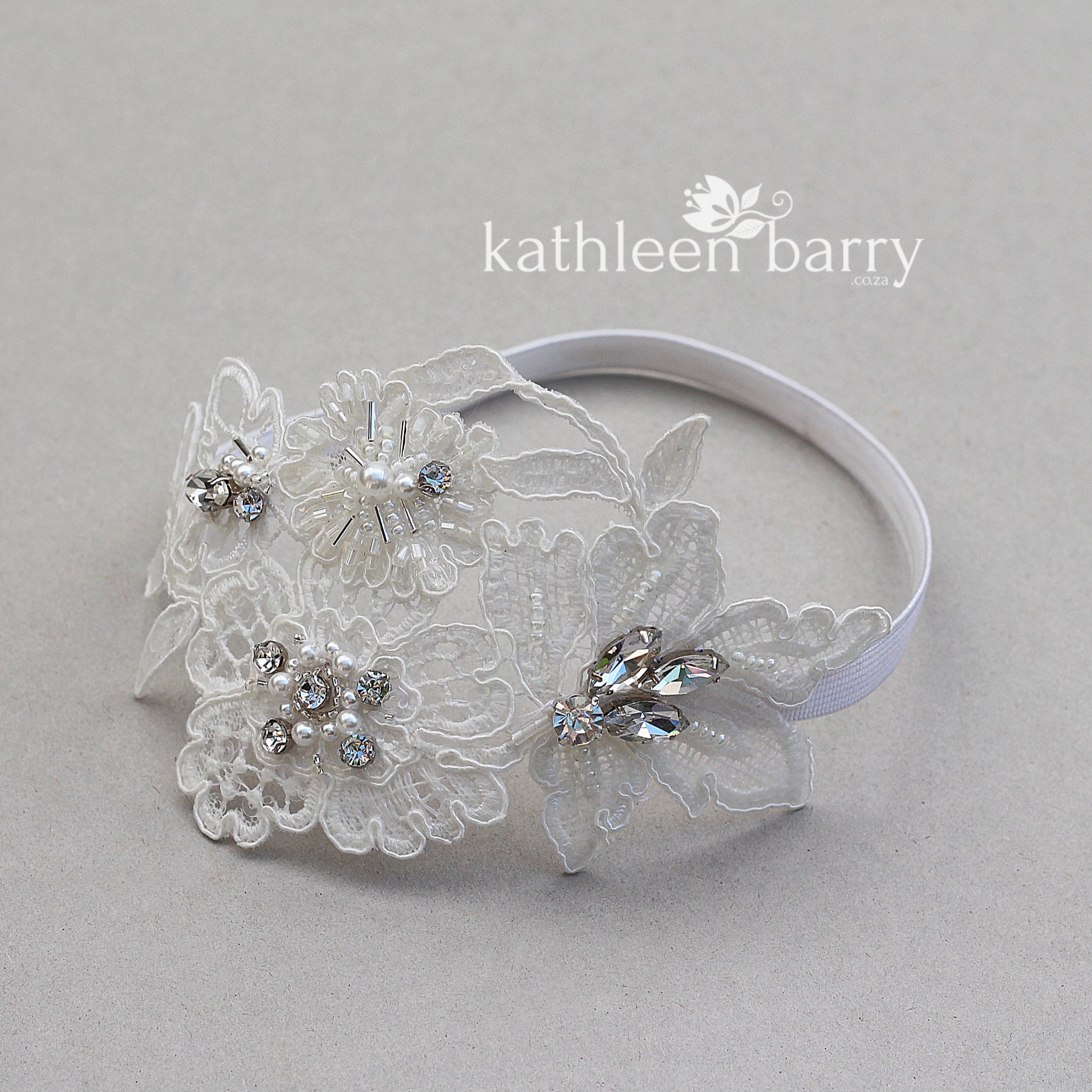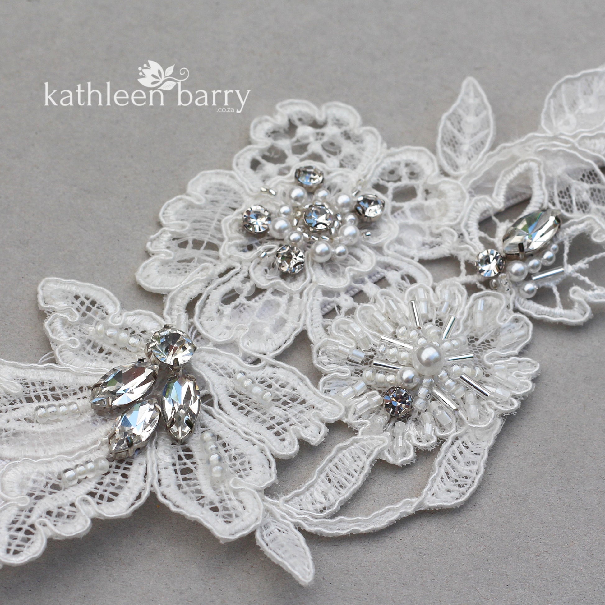 Statement lace motif garter with hand beaded embellishment in crystal rhinestones, Czech glass seed pearls and Japanese seed beads.