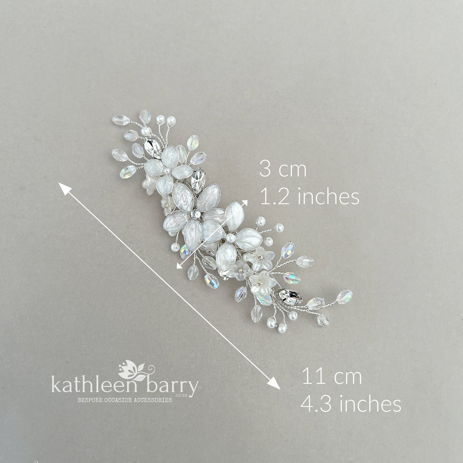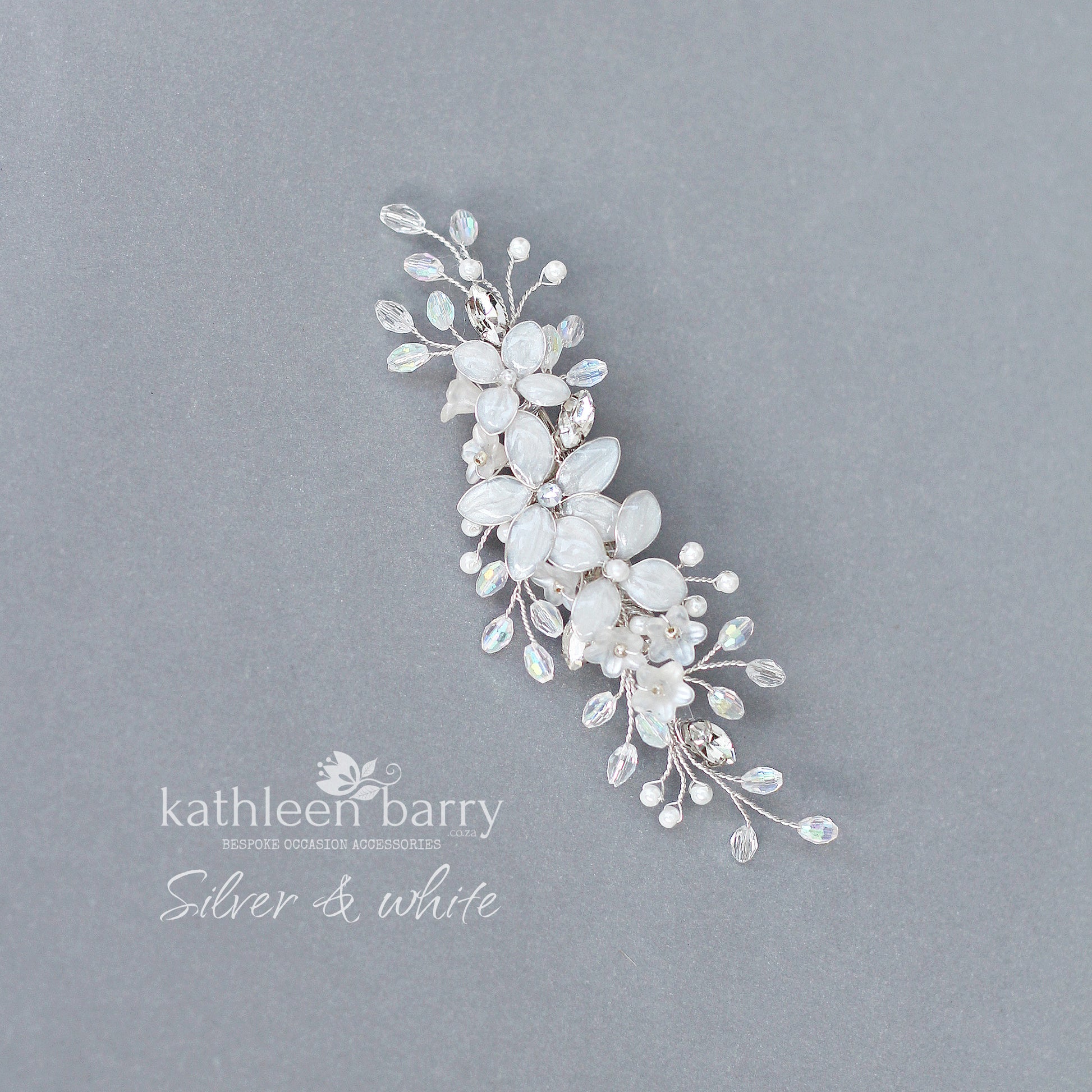A romantic floral spray hair clip, perfect for shorter hairstyles or one side pinned up. Designed for endless styling options, this sturdy clip can be positioned in any direction and is handcrafted to order for a personalized touch.