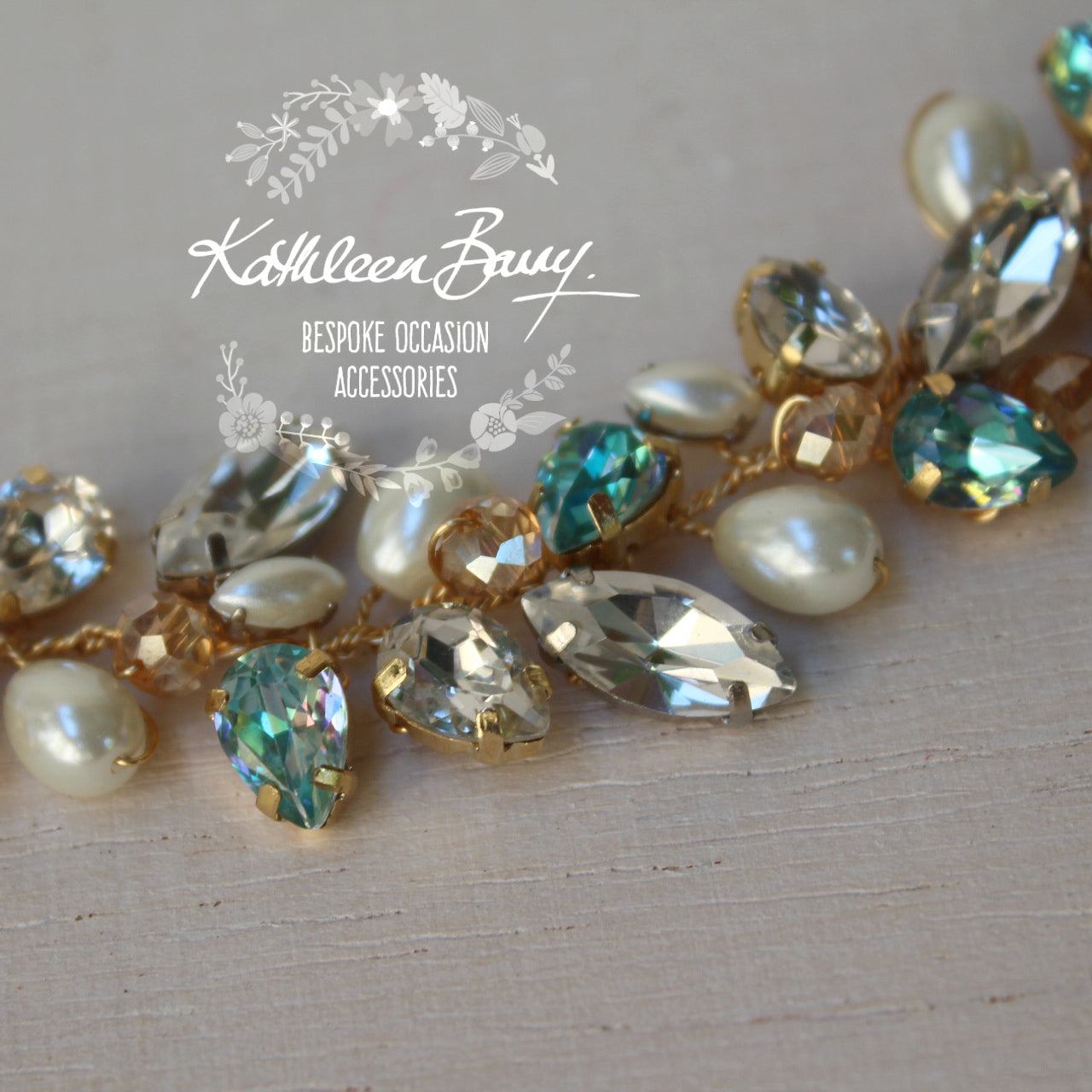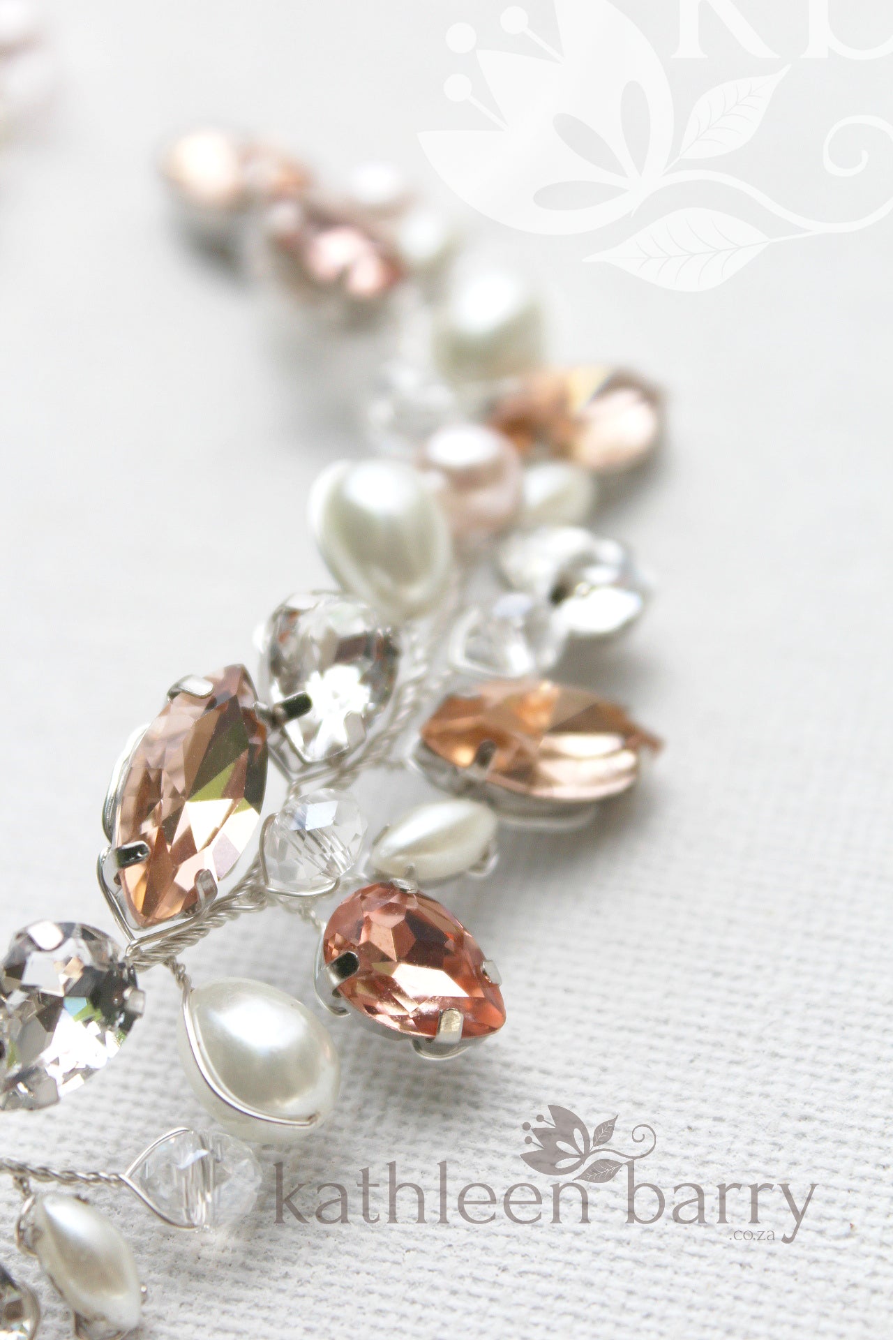 An elegant hair piece, handcrafted with 4mm - 6mm ivory Czech glass pearls drops, elliptical and drop shaped crystal rhinestones (color options on check out). The wire-work in the specific images vary from gold plated, copper, silver plated or rose gold plated.
