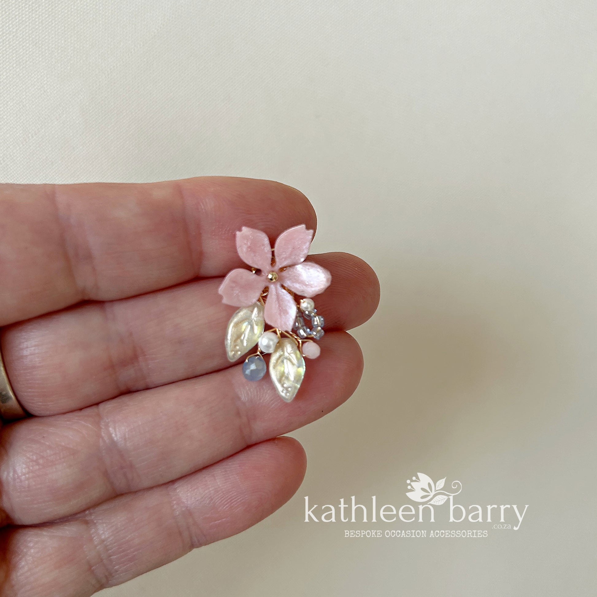 Originally designed to complement the Gisela collection of floral statement necklace, bracelet, and hair accessories, these dainty stud earrings are beautiful pieces in their own right. Handcrafted to add an effortless, romantic touch to your wedding or special occasion look, each pair is made to order and can be tailored to suit your color palette or personal style.