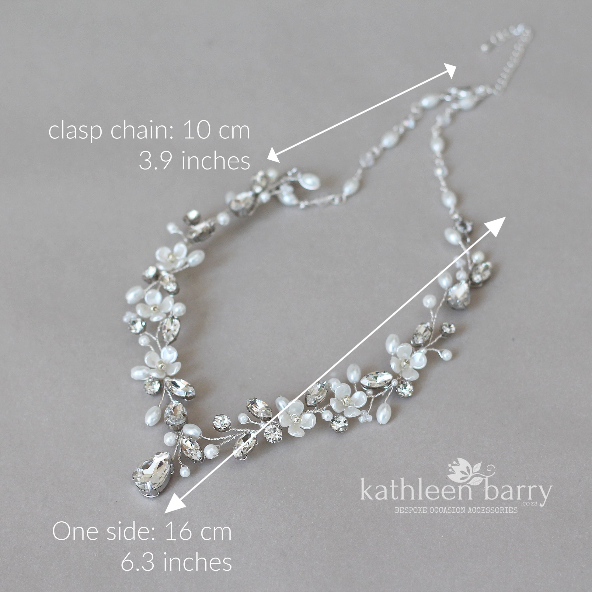 One side of main detail: 16 cm (6.3 inches) + clasp chain 10 cm (3.9 inches)