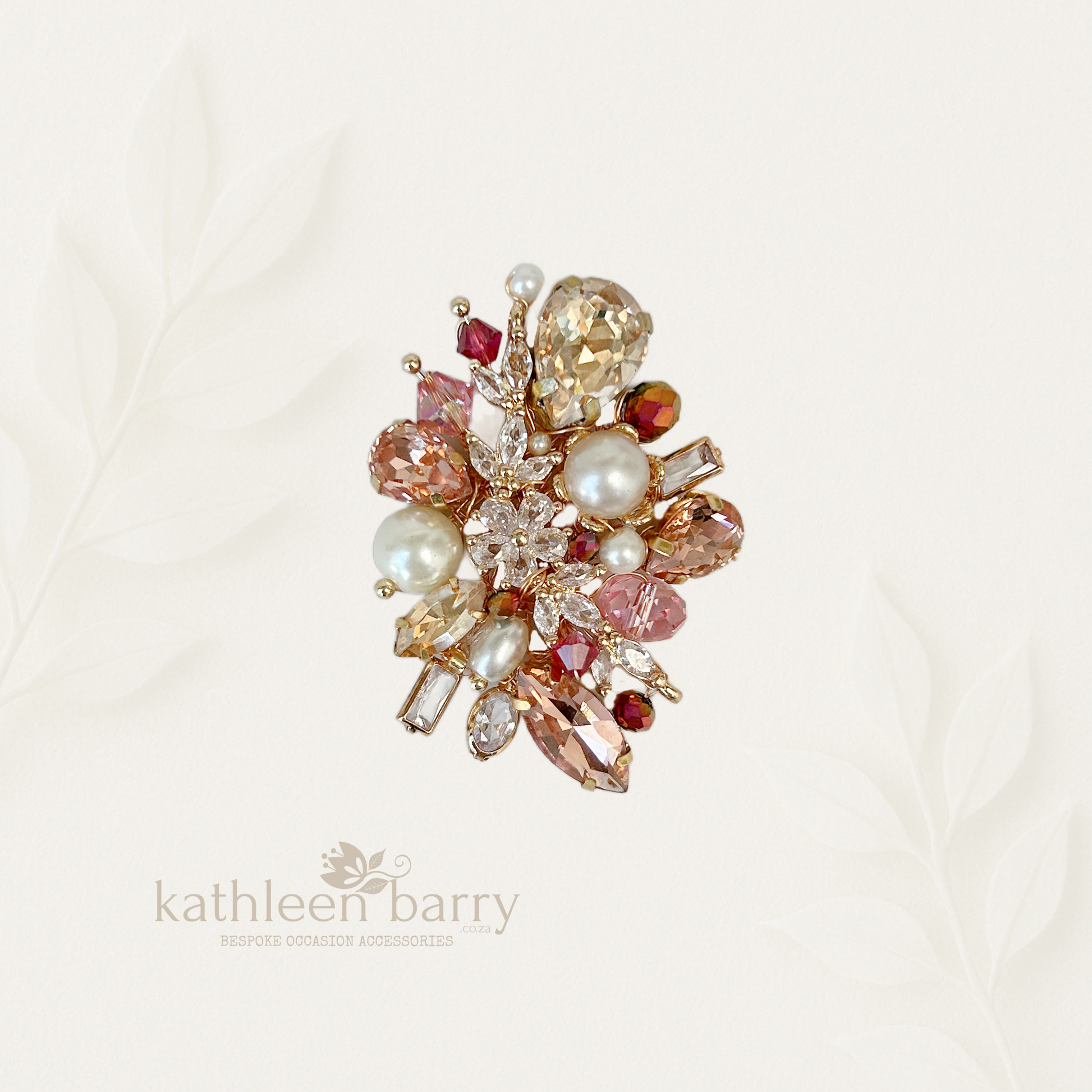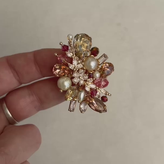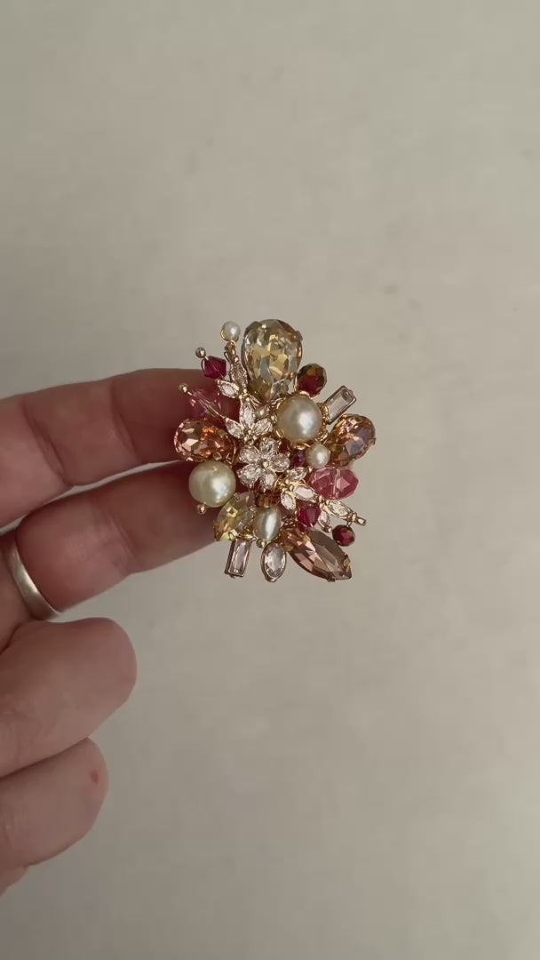 A beautifully detailed handmade brooch shown here is a warm palette of gold, champagne, and peachy pink tones, accented with a hint of fuchsia pink. (custom colors to order) This elegant piece combines the timeless sparkle of rhinestones and cubic zirconia with the soft sheen of pearls, creating a rich and refined look.