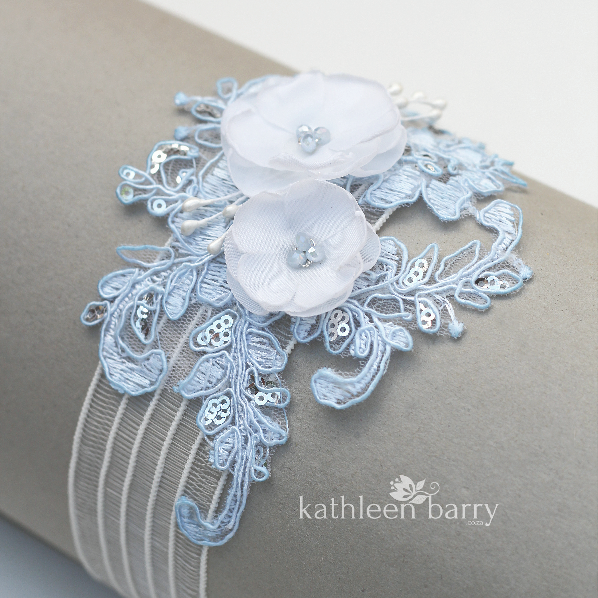 This heirloom garter has been hand crafted with limited edition, hand dyed corded bridal lace with silver micro sequins. Soft white or ivory 3D handmade fabric flowers and Czech glass pearl or crystal centers to match lace color.
