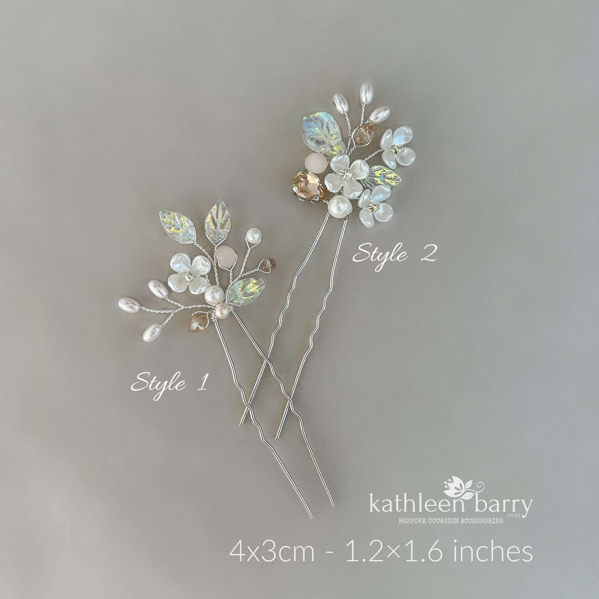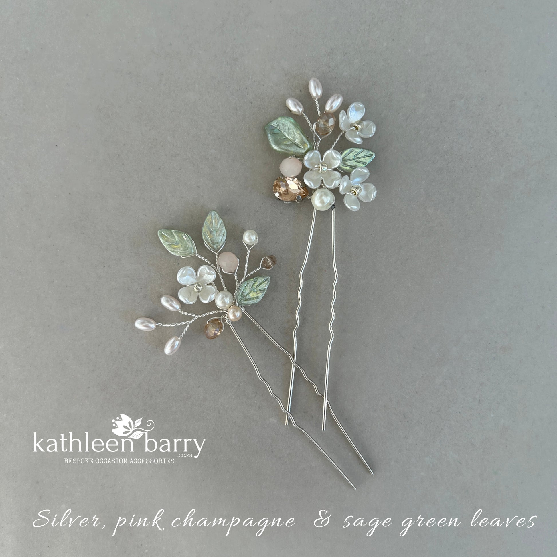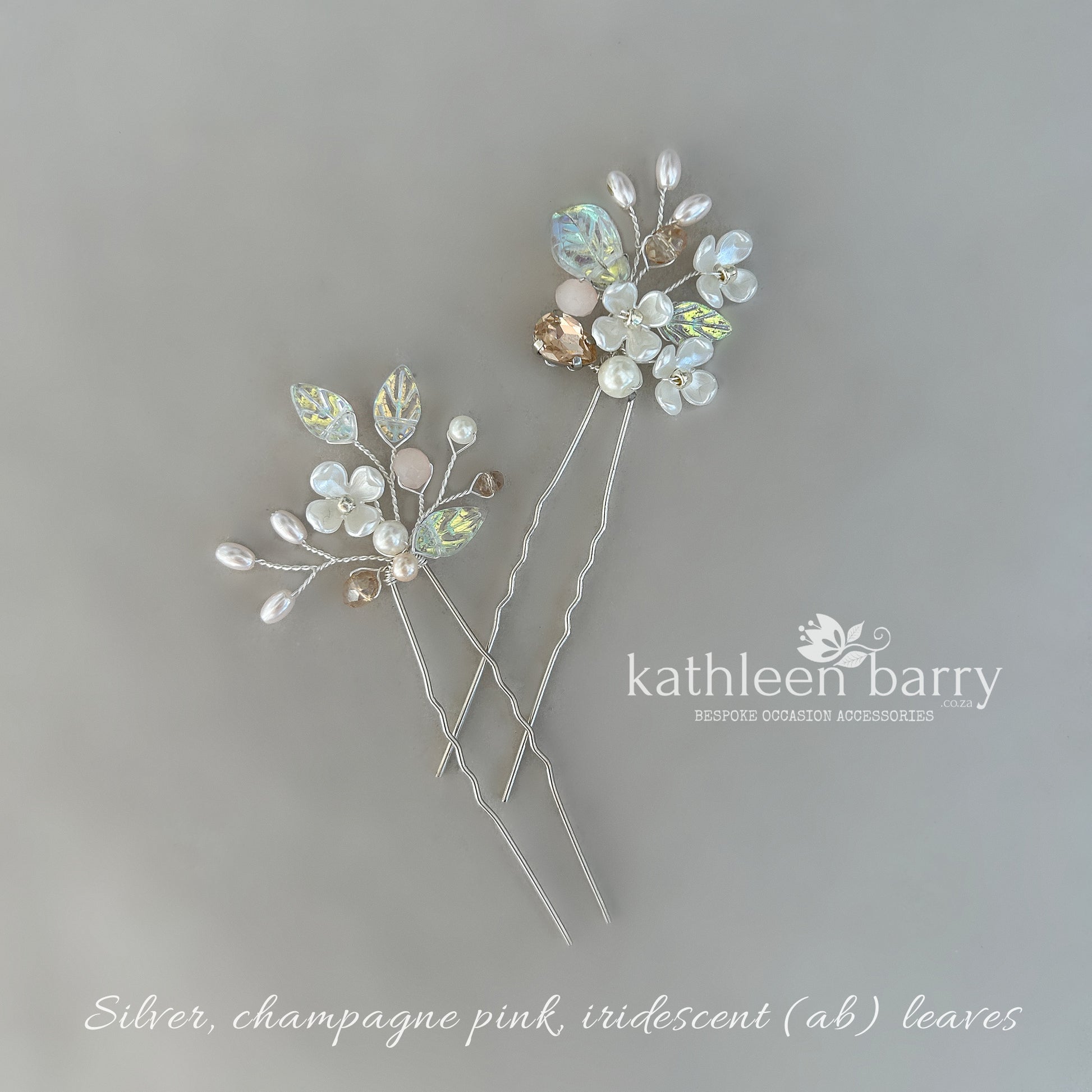 A delicate floral hair pin set from the Kathy design series, designed to be worn individually or layered together for a beautifully coordinated bridal look.