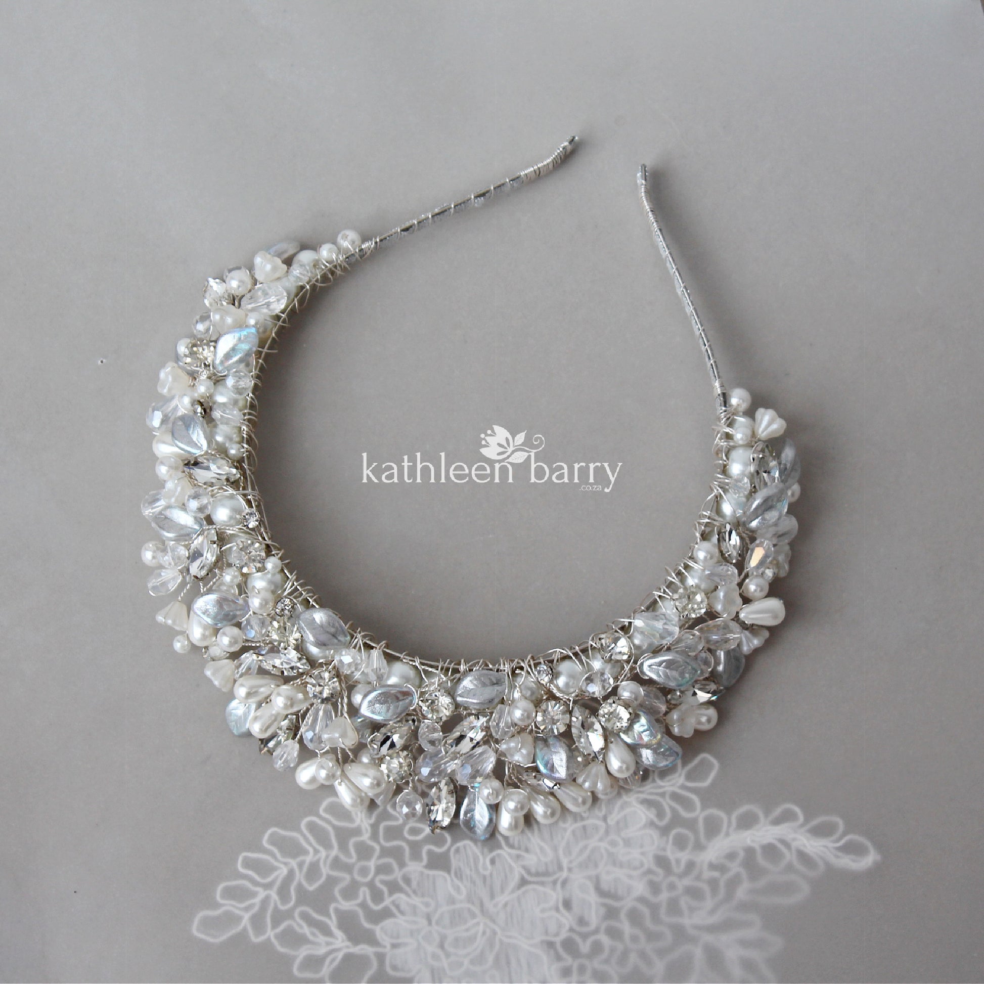 Tiara style bridal crown with assorted crystals, rhinesones, pearl drops, pearl rounds, Czech glass leaves and a scattering of little flowers.