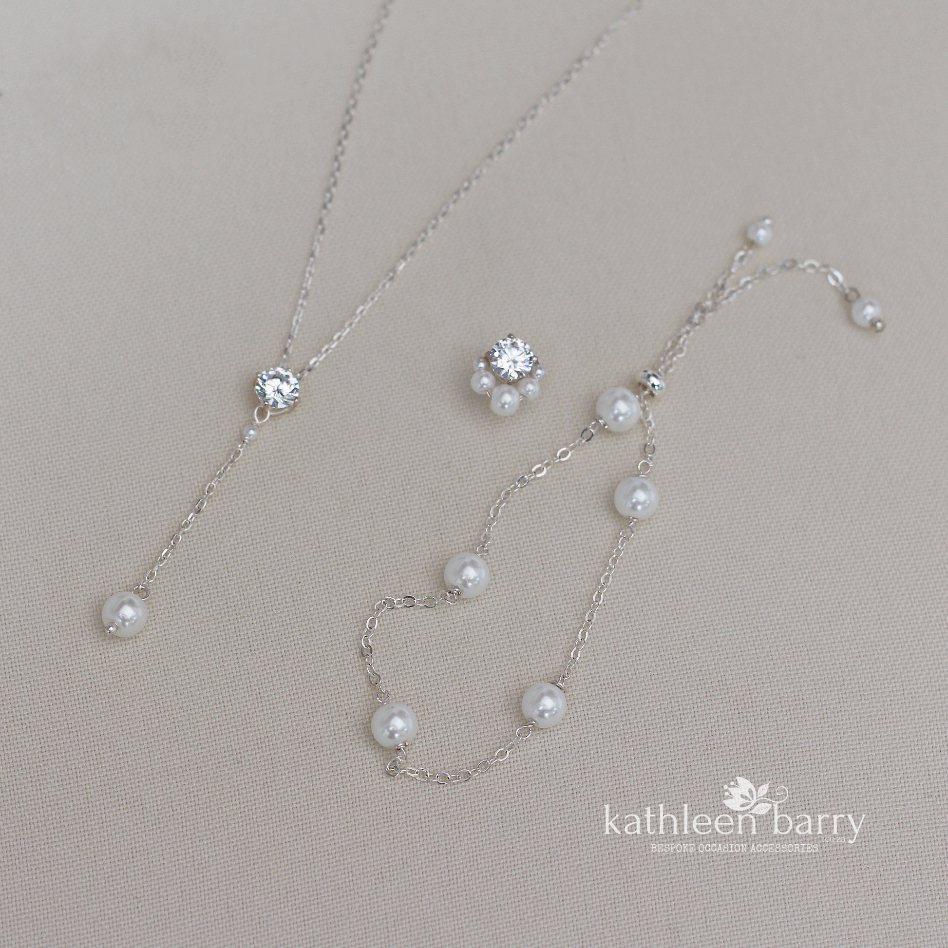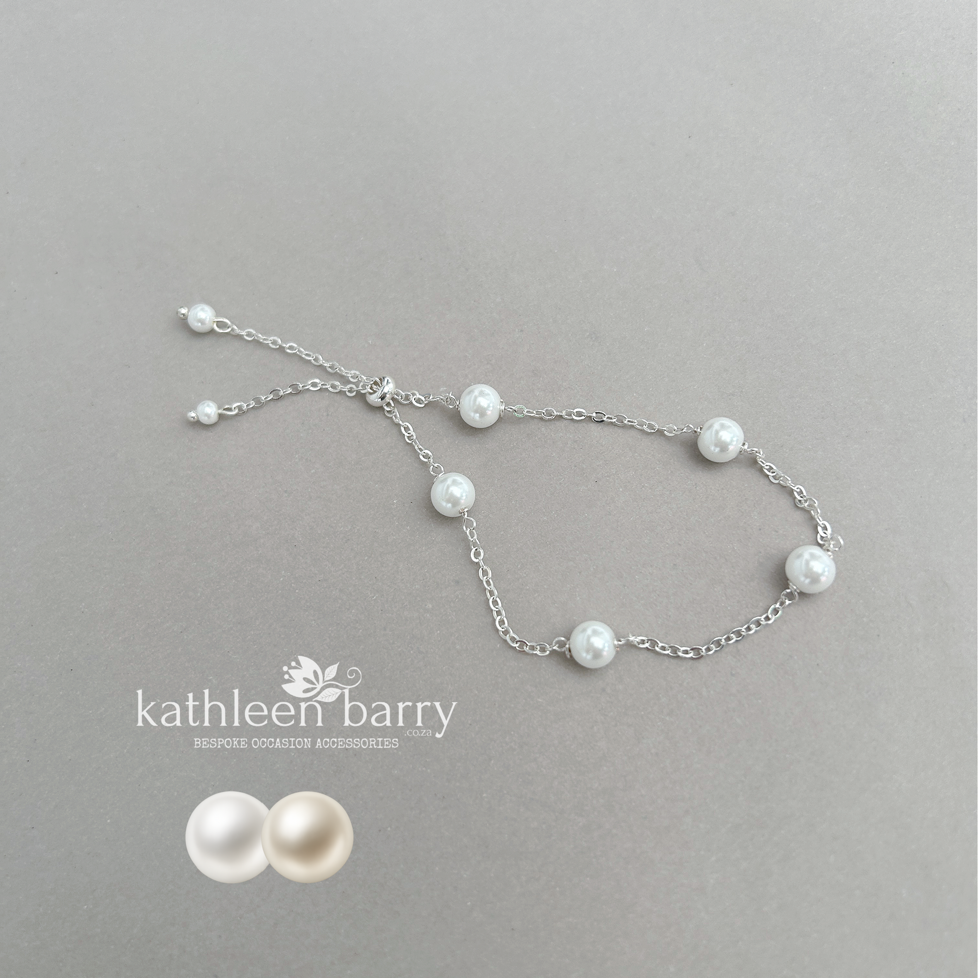 A minimalist modern bracelet designed to complement any bridal or formal look. The delicate chain and floating pearls add just the right touch of sophistication and elegance.