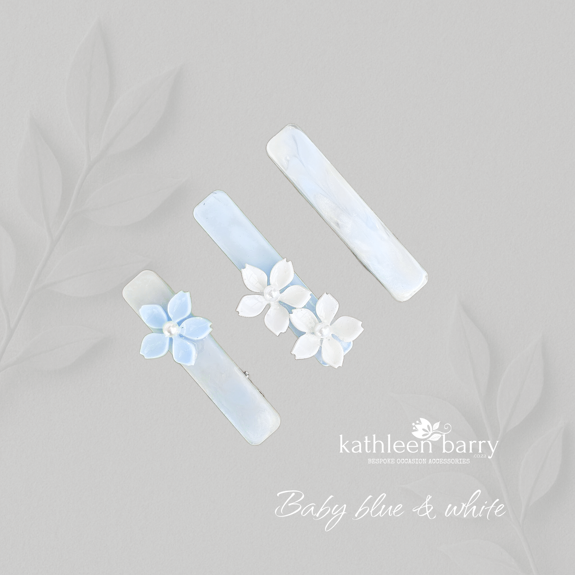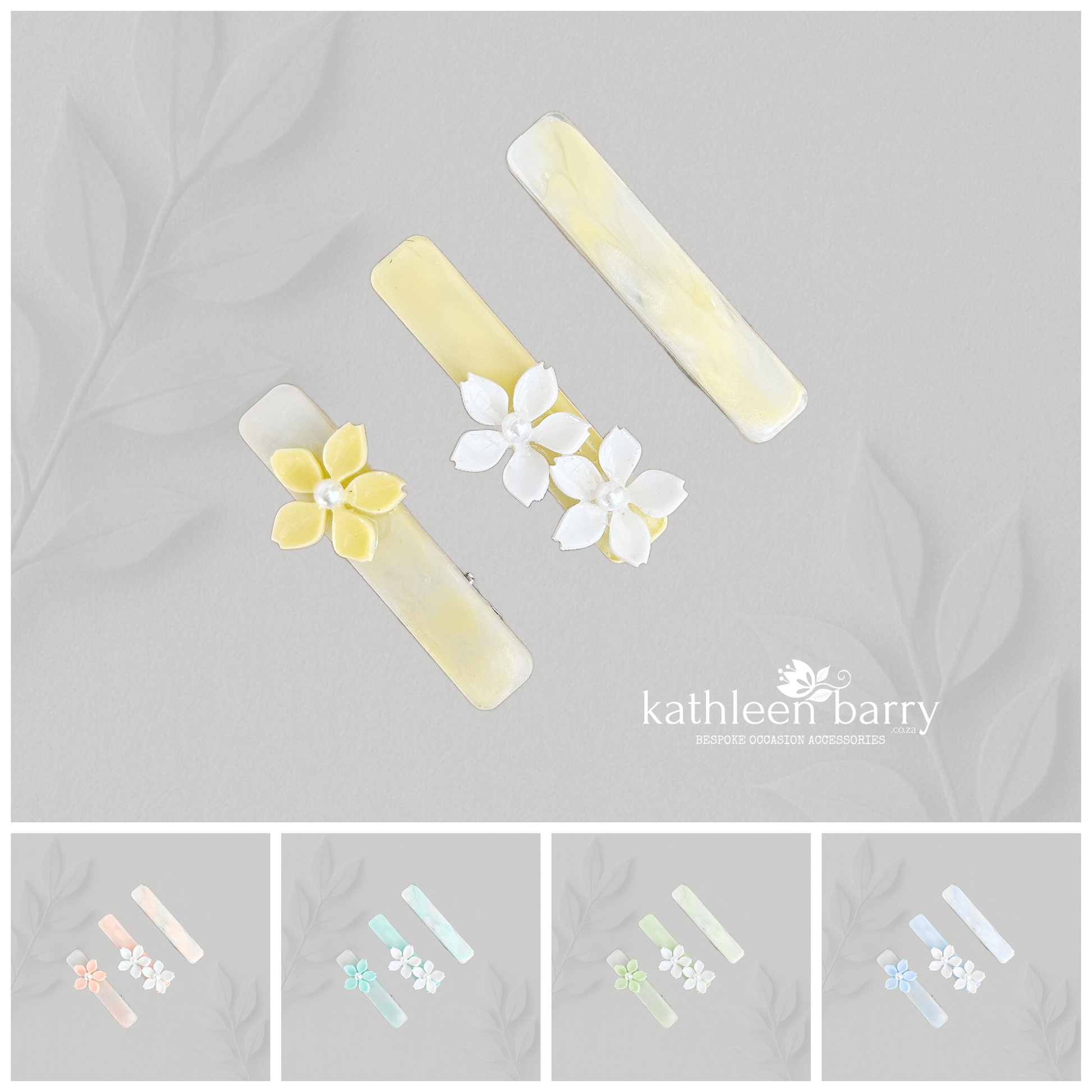 A playful yet minimalist set of three handcrafted resin hair clips, perfect for flower girls, bridesmaids, or everyday wear. With stylized daisy details and a soft, pearly finish, these clips add a fun pop of color while keeping things delicate and wearable.