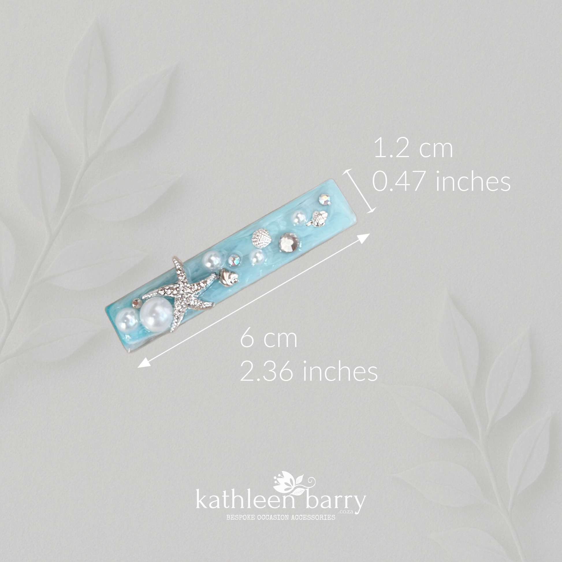A playful yet elegant resin hair clip featuring a diamanté starfish, miniature shell details, faux pearls, and rhinestones — perfect for beach weddings, destination bridesmaids, or coastal-inspired styling.
