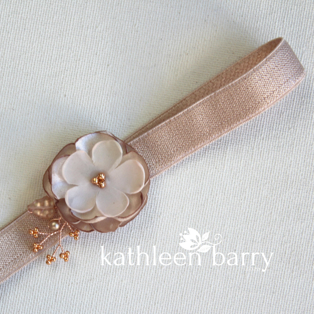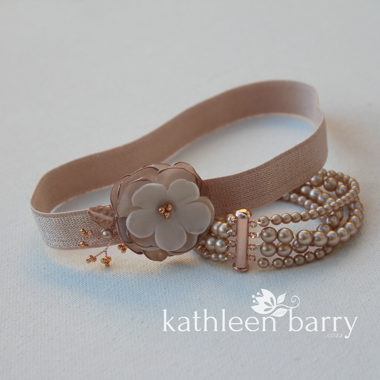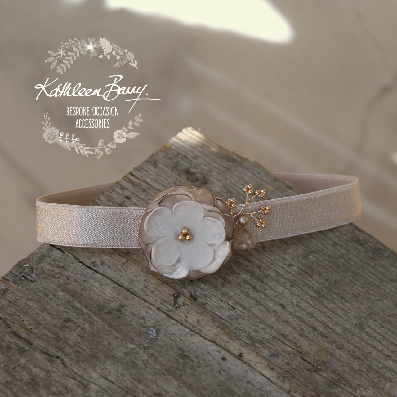 Taupe nude floral garter with rose gold accents, Handmade fabric flowers, Czech glass leaf and Japanese seed bead detailing.