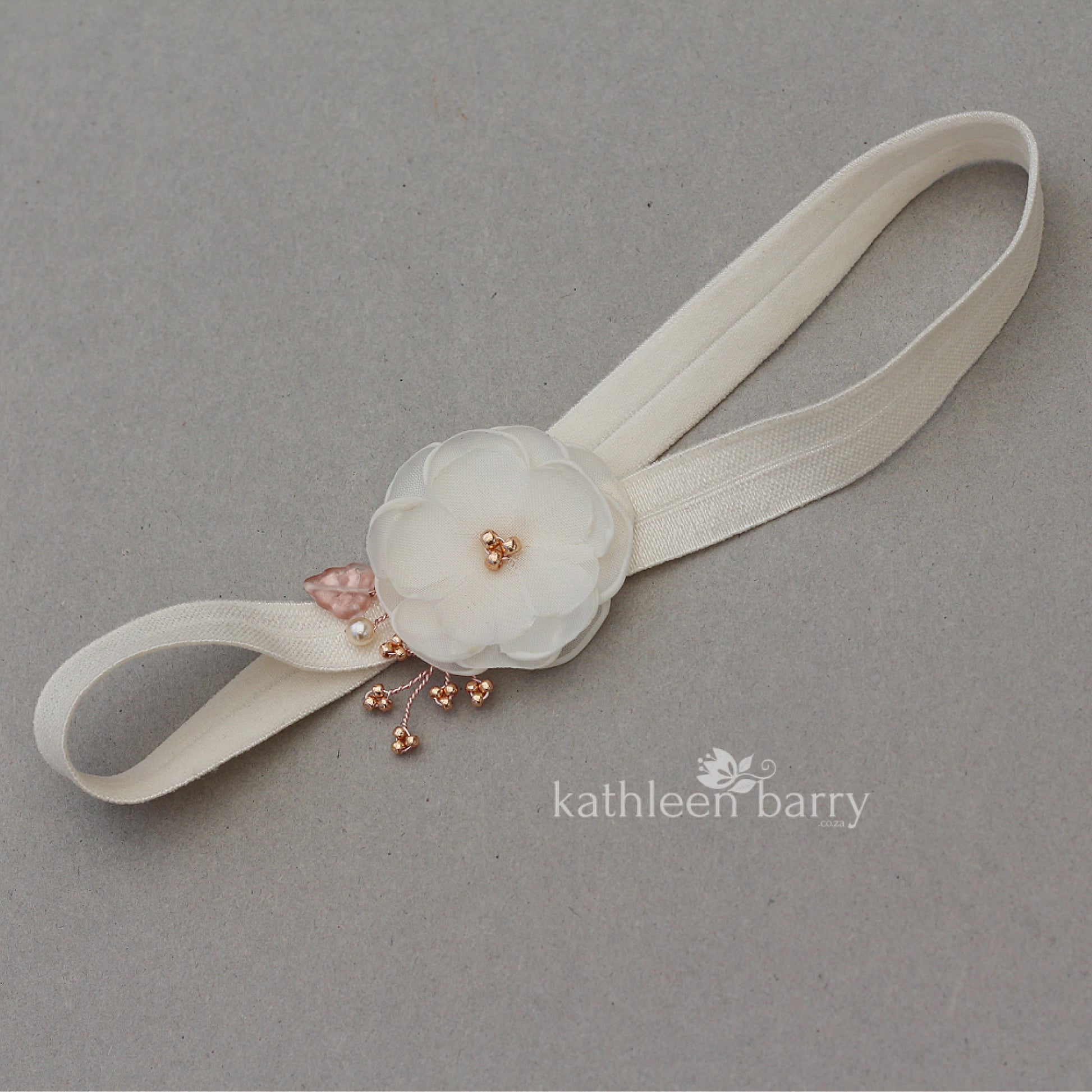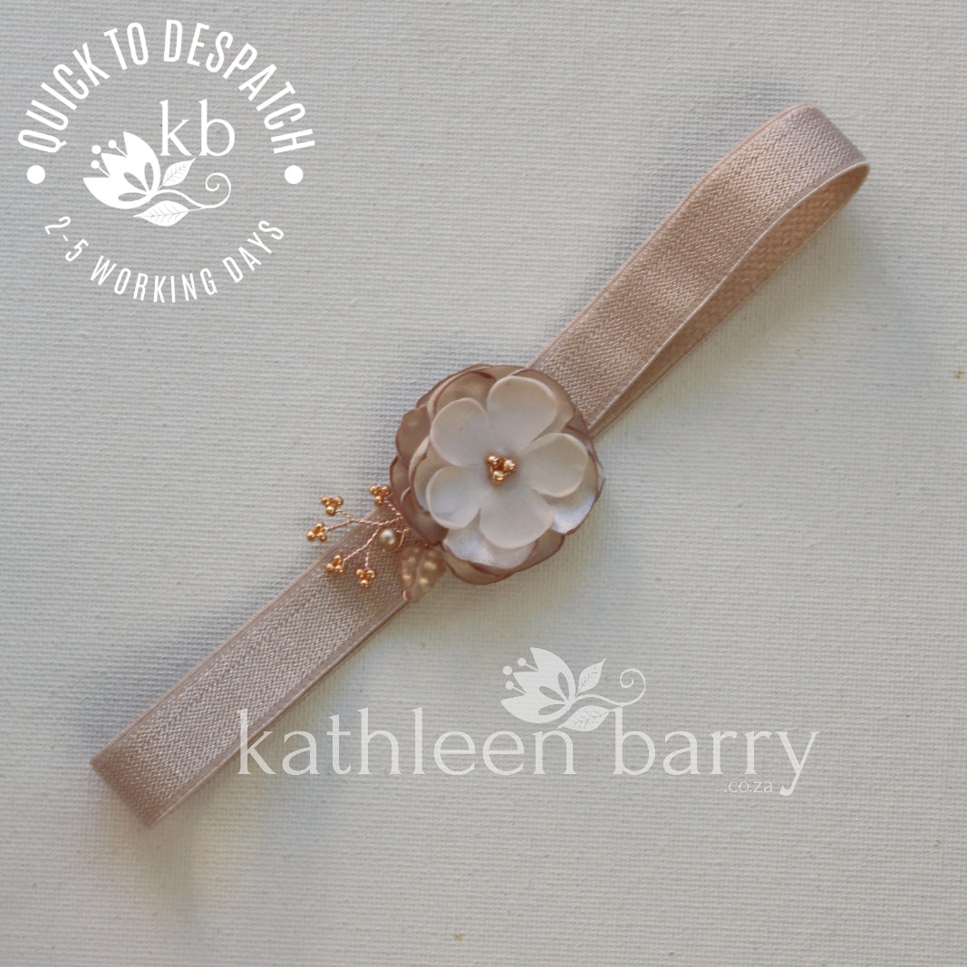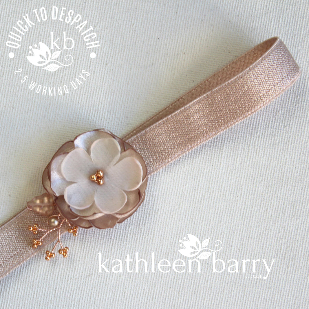 Taupe nude floral garter with rose gold accents, Handmade fabric flowers, Czech glass leaf and Japanese seed bead detailing.